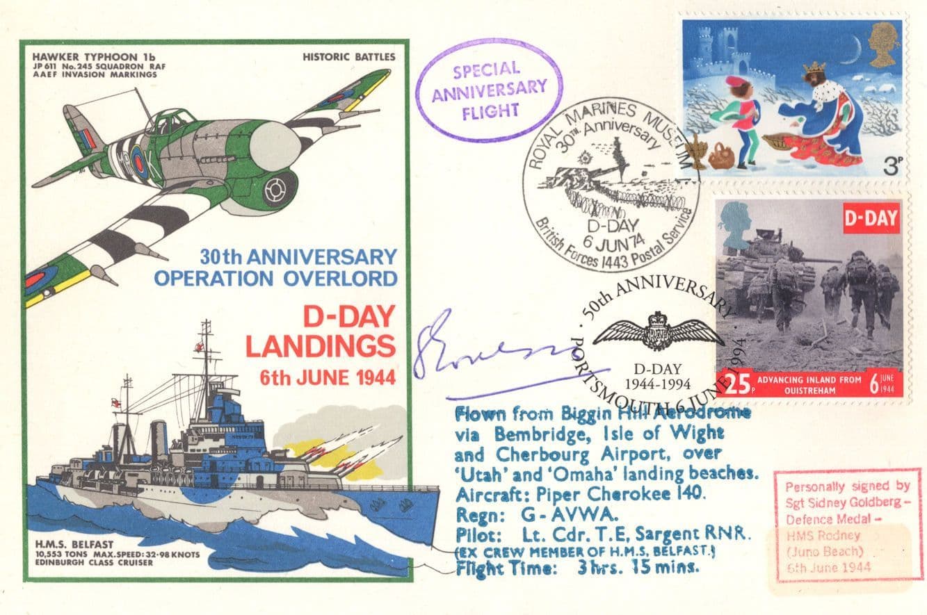 STB026 This is stunning 1974 collectors official limited D-Day Landings first day cover hand signed by Sidney Goldberg where the signature rests perfectly accompanying the special hand commemorative franks. This comes with full lifetime COA as the signing has been officially certified by the publishers with full hallmarking with the series limited edition details of just 17 autographed and the number from the hand signed series reading certified no 8 of 17 in absolute brand new mint condition. You wont source better.