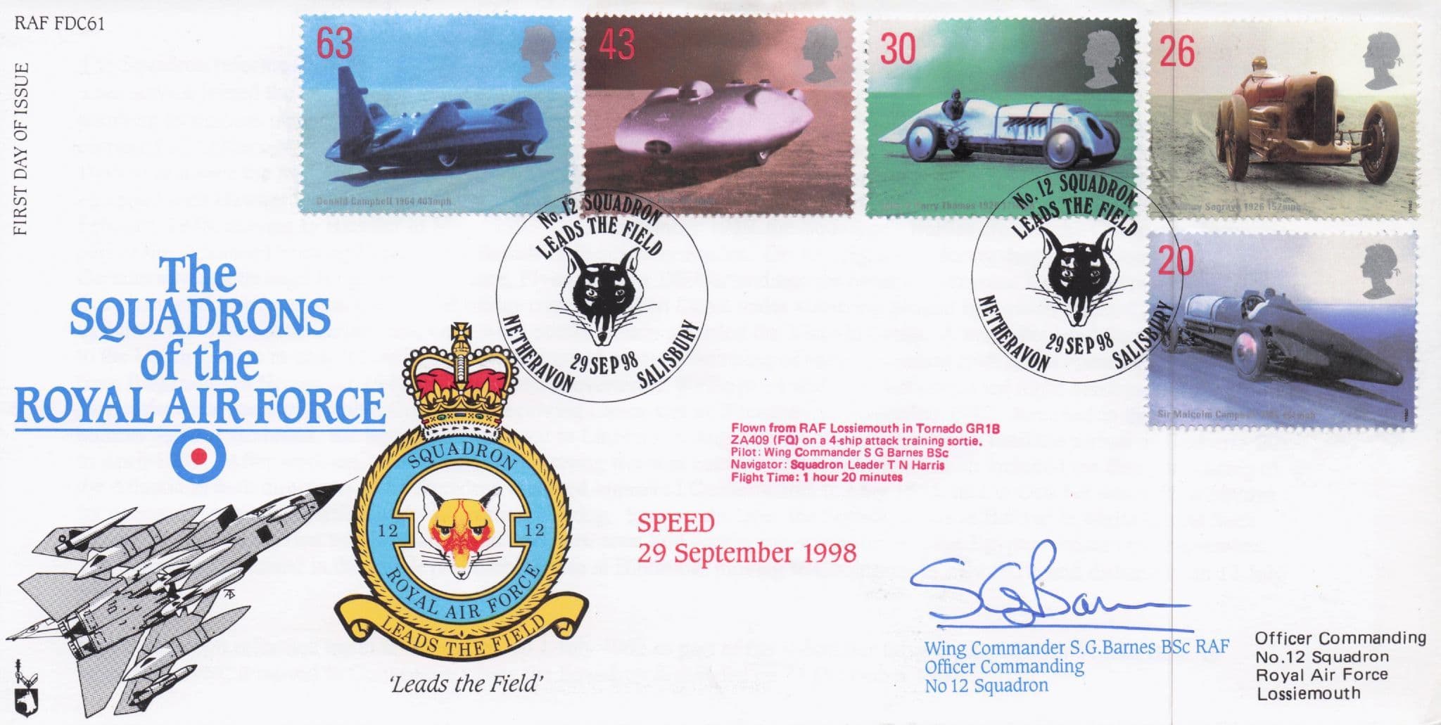 STB038 This is stunning Speed 1998 military collectors official limited edition specially flown "Squadrons Of The Royal Air Force" first day cover hand signed by Wing Commander SG Barnes where the signature rests perfectly accompanying the special hand commemorative franks. Full details of the FDCs historic flight are detailed on reverse too. This comes with full lifetime COA as the signing has been officially certified by the publishers with full hallmarking and authenticity of the series further detailed in truly outstanding condition.