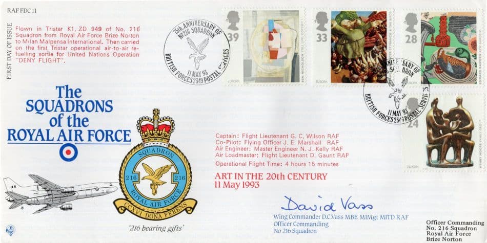 STB02 A rare circa 30 years ago limited edition hand autographed and authenticated first day cover celebrating a union between the Squadrons Of The RAF with a first day of release of 20th Century Art hand signed by historic Wing Commander of 236 Squadron which the signature is fully authenticated by the publishers on reverse together with its limited edition number from the series in mint condition. (this cover was also specially flown - please enlarge and read its flight details for your full examination).