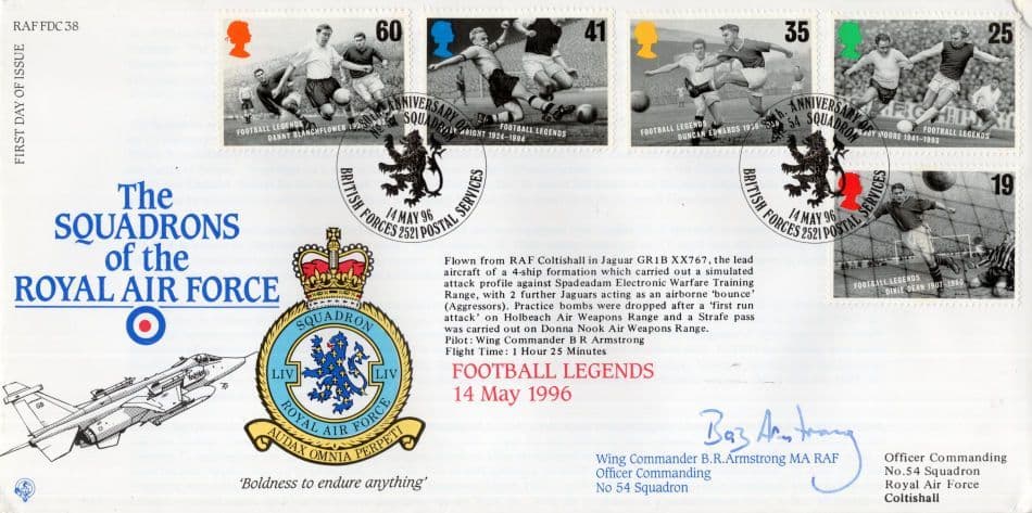 STB02 A rare circa 30 years ago limited edition hand autographed and authenticated first day cover celebrating a union between the Squadrons Of The RAF with a first day of release of Football Legends including Bobby Moore hand signed by historic Wing Commander of 54 Squadron which the signature is fully authenticated by the publishers on reverse together with its limited edition number from the series in mint condition. (this cover was also specially flown from RAF Coltishall - please enlarge and read its flight details for your full examination).
