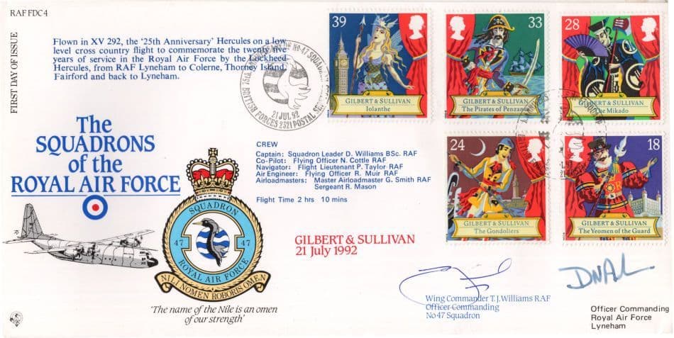 STB01 A rare circa 30 years ago limited edition hand autographed and authenticated first day cover celebrating a union between the Squadrons Of The RAF with a first day of release of Gilbert & Sullivan hand signed by historic Officer Commander of 47 Squadron which the signature is fully authenticated by the publishers on reverse together with its limited edition number from the series in mint condition. (this cover was also specially flown - please enlarge and read its flight details for your full examination).