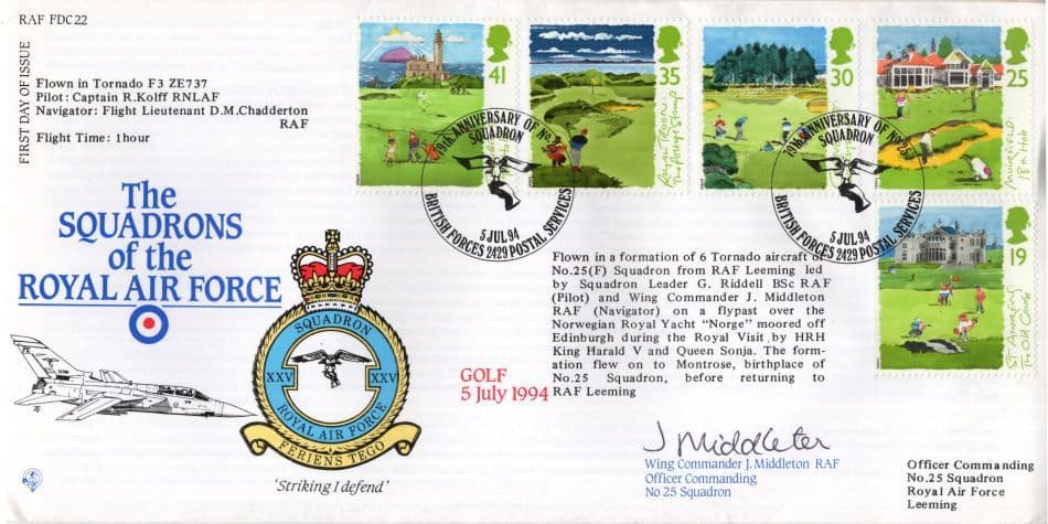 STB01 A rare circa 30 years ago limited edition hand autographed and authenticated first day cover celebrating a union between the Squadrons Of The RAF with a first day of release of Golfing and golf courses around the United Kingdom hand signed by historic Wing Commander of 20 Squadron which the signature is fully authenticated by the publishers on reverse together with its limited edition number from the series in mint condition. (this cover was also specially flown - please enlarge and read its flight details for your full examination).