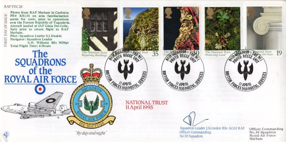 STB01  A rare circa 30 years ago limited edition hand autographed and authenticated first day cover celebrating a union between the Squadrons Of The RAF with a first day of release of National Trust 1995 hand signed by historic Officer Commander of 39 Squadron which the signature is fully authenticated by the publishers on reverse together with its limited edition number from the series in mint condition.