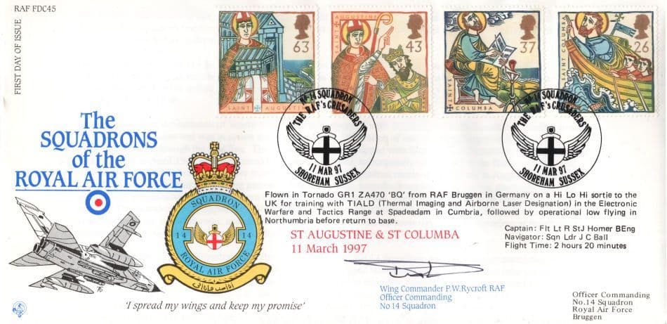 STB02 A rare circa 30 years ago limited edition hand autographed and authenticated first day cover celebrating a union between the Squadrons Of The RAF with a first day of release of St Augustine & Columba hand signed by historic Wing Commander of 14 Squadron which the signature is fully authenticated by the publishers on reverse together with its limited edition number from the series in mint condition. (this cover was also specially flown - please enlarge and read its flight details for your full examination).