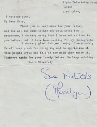 HG64 A fascinating opportunity to secure this vintage 1965 hand signed letter from Sue Nicholls when she was part of the cast for the TV series Crossroads - she talks about how much fun she is having filming it - all the people she works with etc- it has some small aging but very good condition folded just once but with small faults my grading vg minus - it is fully hand signed and sent from ATV Studios Birmingham
