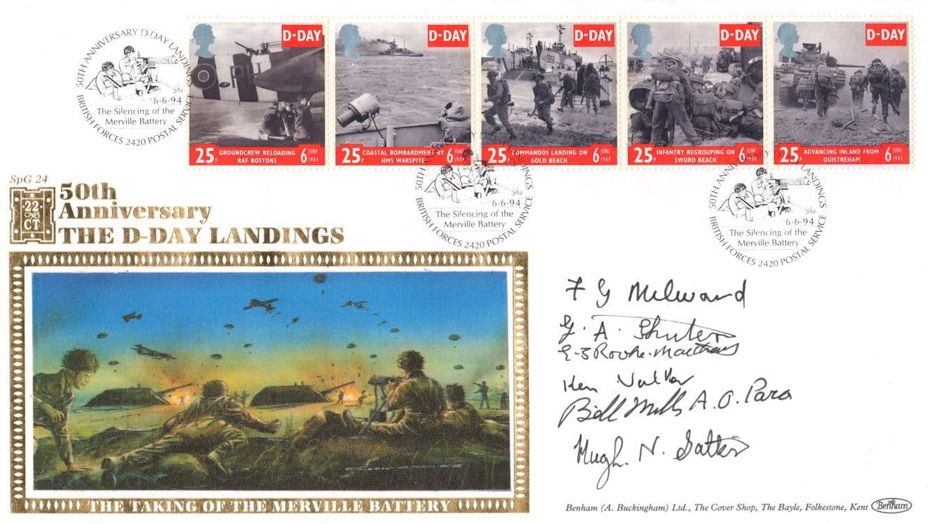 STB026 This is stunning collectors Buckingham official limited Taking Of The Merville first day cover hand signed by FIVE of the veterans where the signature rests perfectly accompanying the special hand commemorative franks. This comes with full lifetime COA as the signing has been officially certified by the publishersin absolute brand new mint condition. You wont source better.