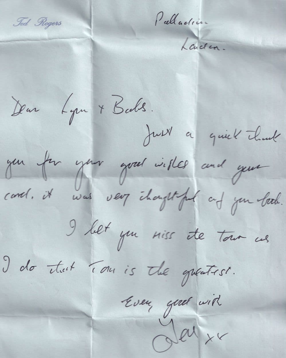 snw0602  This is a superb opportunity to secure this original 1960s hand written and signed letter from Ted Rogers famous 1960s star who went on to host 3-2-1 to a fan who saw his show when he supported Tom Jones on tour - it is folded a number of times where posted but otherwise very good condition and sent on Ted Rogers official headed paper and posted from the London Palladium (please see all my Tom Jones souvenirs at my store including the programmes with Ted Rogers supporting too)