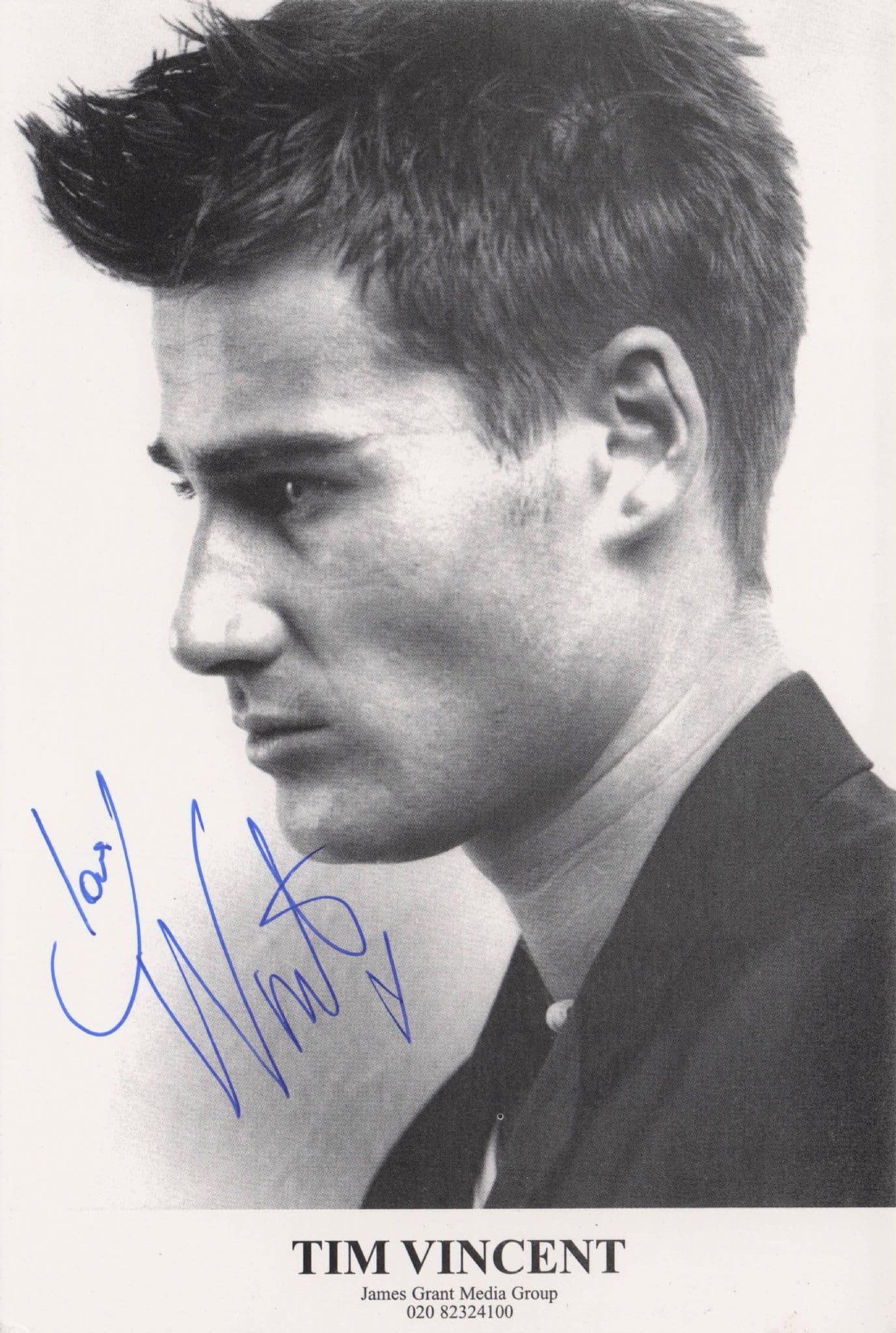 PFAS213 This is a superb opportunity to secure this original 6" x 4" hand signed photo for Tim Vincent of Blue Peter this being a very rarely found management souvenir to book Tim Vincent with the management coompany contact details. It has almost made him appear into a musicianand Tim Vincent has personally autographed the souvenir where his signature rests perfectly accompanying his portrait in mint condition and undedicated too. You won't source better.