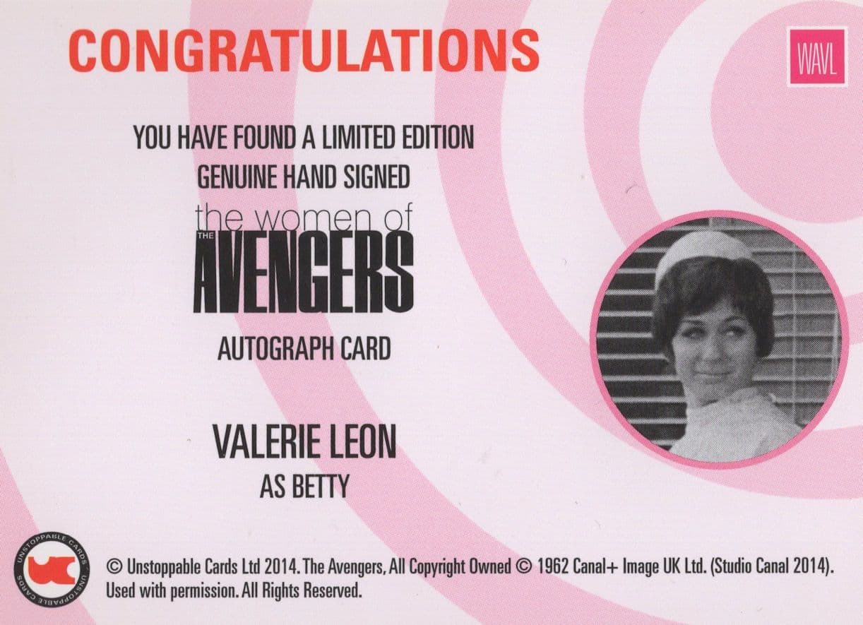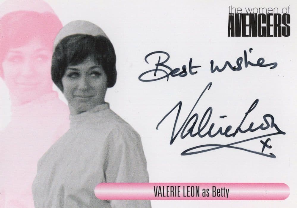 TC11 Surely the best opportunity of its kind to secure this rare personal signing of Valerie Leon as Betty in The Avengers and of which her hand signature is placed perfectly below her portrait. This is the official Avengers TV series show souvenir and this signing has been fully validated on the reverse for the ultimate in lifetime authentification. It reads on the other side "Congratulations..You have just received a limited edition personally autographed Women Of The Avengers trading card signed by Valerie Leon as Betty" - It is in absolute mint condition. Same day UK dispatch.