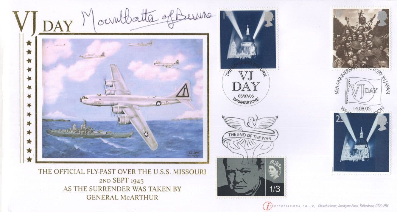 STB09  This is stunning collectors official limited Official Fly Post on the USS MIssouri on 2nd Sept 1945 on VJ Day first day cover hand signed by the Mountbatten Of Burma where the signature rests perfectly accompanying the special hand commemorative franks.  This comes with full lifetime COA as the signing has been officially certified by the publishers with full hallmarking and authenticity of the series further detailed in absolute brand new mint condition. You wont source better.