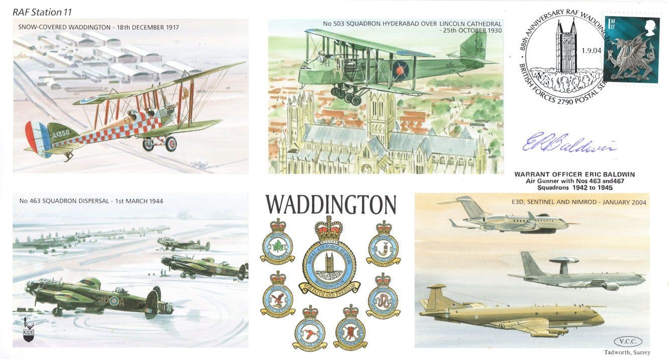 STB021 This is stunning RAFWaddington collectors official limited first day cover hand signed by historic veteran of D-Day Eric Baldwin of 463 & 467 Squadrons where the signature rests perfectly accompanying the special hand commemorative franks. This comes with full lifetime COA as the signing has been officially certified by the publishers with full hallmarking and authenticity of the series further detailed in absolute brand new mint condition with additional signature on reverse to fully authenticate and a large map of Waddington which this edition is LIMITED TO ONLY 80 and numbered 40 from the series (see image 2). You wont source better.