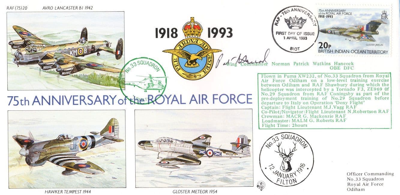 STB026 This is stunning 1993 Filton RAF first day cover hand signed by Wing Commander Patrick Hancock with special first day of issue commemorative franks in mint condition. Has a second frank on front which is 1916 33 Squadron but this is from the same day of issue but the limited edition certification of the souvenir. Hand signed on reverse by a Captain too.