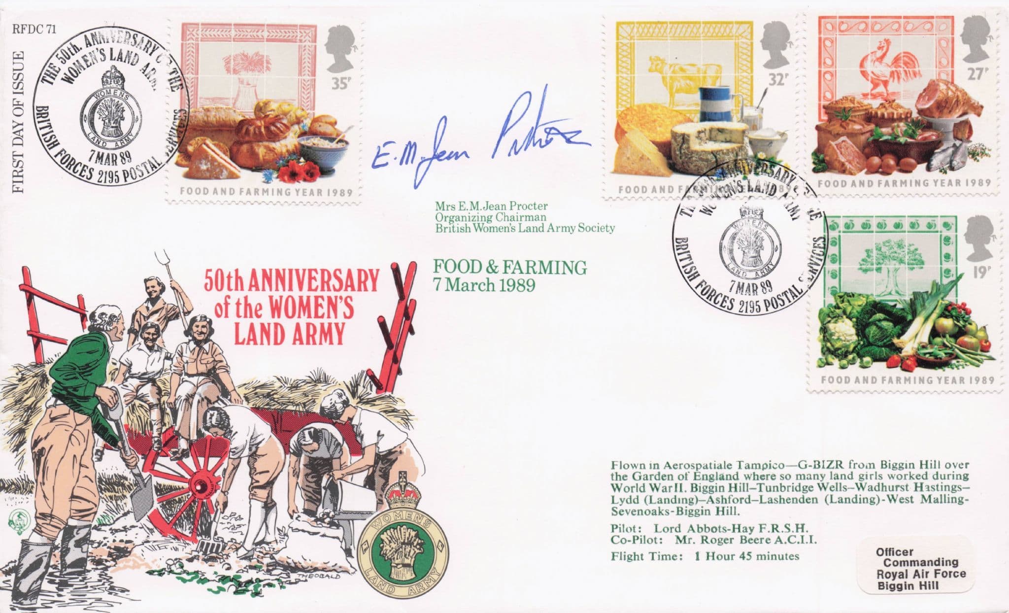 STB037  A stunning 1989 British Womens Land Army 50th Anniversary first day cover hand signed by 1980 chair woman of the land army Jean Proctor where her signature rests perfectly accompanying the first day of issue special franks - underneath is details of the special flight the FDC was part of from the signing and a further signature from the publishers on the reverse for lifetime COA. It is mint condition.