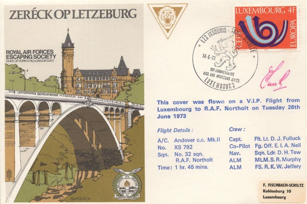 STB06 An amazing first day cover from 1973 for the RAF Escaping Society with all its commemorative franks which was specially & historically flown over 50 years ago through a fantastic military journey (see scan) which has been personally signed by the RAF flight member which was carried from Luxembourg to Northolt in mint condition.
